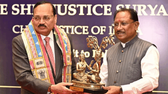 मुख्यमंत्री विष्णुदेव साय ने भारत के मुख्य न्यायाधीश न्यायमूर्ति सूर्यकांत का किया आत्मीय स्वागत