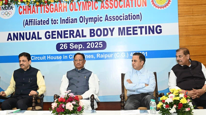 रायपुर। मुख्यमंत्री विष्णु देव साय आज राजधानी रायपुर स्थित सर्किट हाउस सभागार में आयोजित छत्तीसगढ़ ओलंपिक एसोसिएशन की वार्षिक आम सभा की बैठक में शामिल हुए। इस दौरान बैठक में वर्ष 2024-25 की ऑडिट रिपोर्ट का अनुमोदन, वर्ष 2025-26 का वार्षिक बजट प्रस्तुतिकरण एवं अनुमोदन, वर्ष 2025-26 हेतु ऑडिटर की नियुक्ति सहित अन्य महत्वपूर्ण एजेंडा पर चर्चा की गई। छत्तीसगढ़ ओलंपिक एसोसिएशन के अध्यक्ष एवं मुख्यमंत्री श्री विष्णुदेव साय ने कार्यक्रम को संबोधित करते हुए बड़ी घोषणा की। उन्होंने कहा कि अब छत्तीसगढ़ से ओलंपिक में भाग लेने वाले प्रतिभागियों…