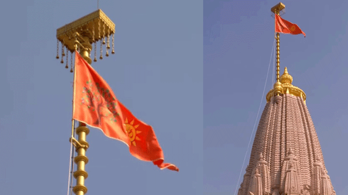 श्रीराम मंदिर के शिखर पर धर्म ध्वज फहराया, PM मोदी-भागवत ने किया ध्वजारोहण: सूर्य, ॐ और कोविदार वृक्ष से है सुसज्जित