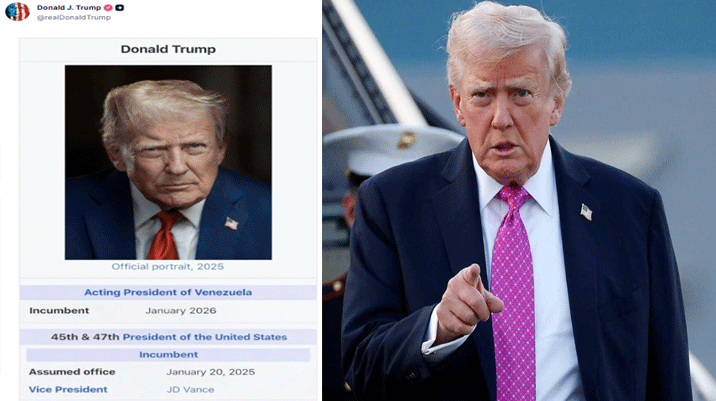 वॉशिंगटन । अमेरिकी राष्ट्रपति डोनाल्ड ट्रंप ने एक फोटो शेयर की है जिसमें उन्हें ‘वेनेजुएला का एक्टिंग प्रेसिडेंट’ दिखाया गया है। यह फोटो विकिपीडिया की एक एडिटेड पेज की लग रही है, जिसमें ट्रंप को जनवरी 2026 तक ‘वेनेजुएला का राष्ट्रपति’ दिखाया गया है। इसमें उनके असली ऑफिशियल पद, यूनाइटेड स्टेट्स के 45वें और 47वें राष्ट्रपति का भी जिक्र है। यह सब ट्रंप की उन टिप्पणियों के बाद आया है, जिसमें उन्होंने कहा था कि यूनाइटेड स्टेट्स वेनेजुएला की लीडरशिप के साथ बहुत अच्छे से काम कर रहा है। साथ…