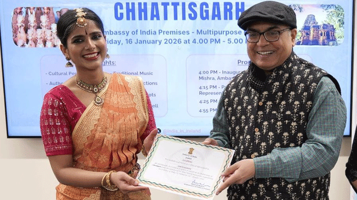 रायपुर। आयरलैंड की राजधानी डबलिन में भारत की सांस्कृतिक विविधता की एक सशक्त झलक देखने को मिली, जब स्टेट कल्चरल इवेंट सीरीज़ के तहत भारतीय दूतावास, डबलिन द्वारा छत्तीसगढ़ राज्य पर केंद्रित भव्य सांस्कृतिक आयोजन का सफल आयोजन किया गया। इस कार्यक्रम में आयरलैंड में रह रहे भारतीय समुदाय के सदस्यों ने भी उत्साहपूर्वक सहभागिता की। कार्यक्रम का उद्घाटन आयरलैंड में भारत के राजदूत श्री अखिलेश मिश्रा द्वारा किया गया। उन्होंने छत्तीसगढ़ की समृद्ध सांस्कृतिक विरासत, जनजातीय परंपराओं और राज्य की विशिष्ट पहचान पर प्रकाश डालते हुए कहा कि ऐसे…